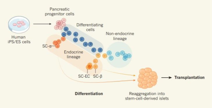 人類胰島細(xì)胞的體外分化及重組。(圖片來(lái)源:Nature)