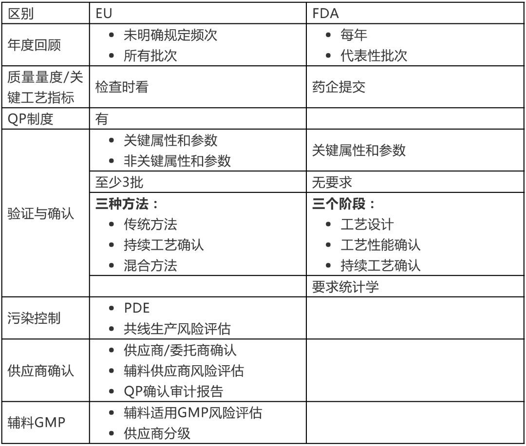 盡管EU與FDA的GMP指南非常相似,但仍有一些地方是不同的,如年度回顧、QP制度、確認與驗證、供應商審計、交叉污染風險評估、輔料要求等。如下
